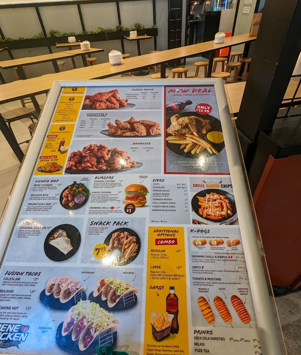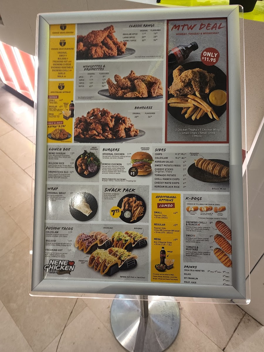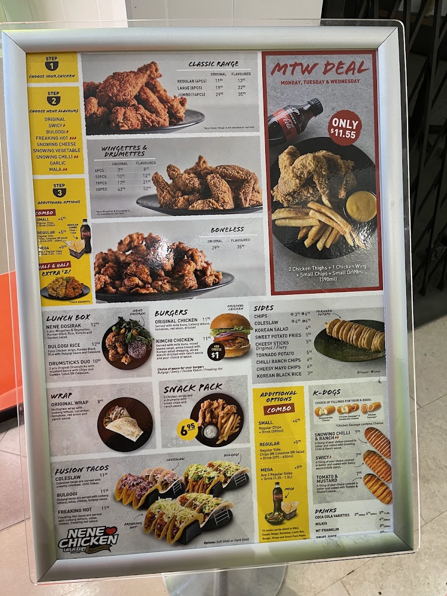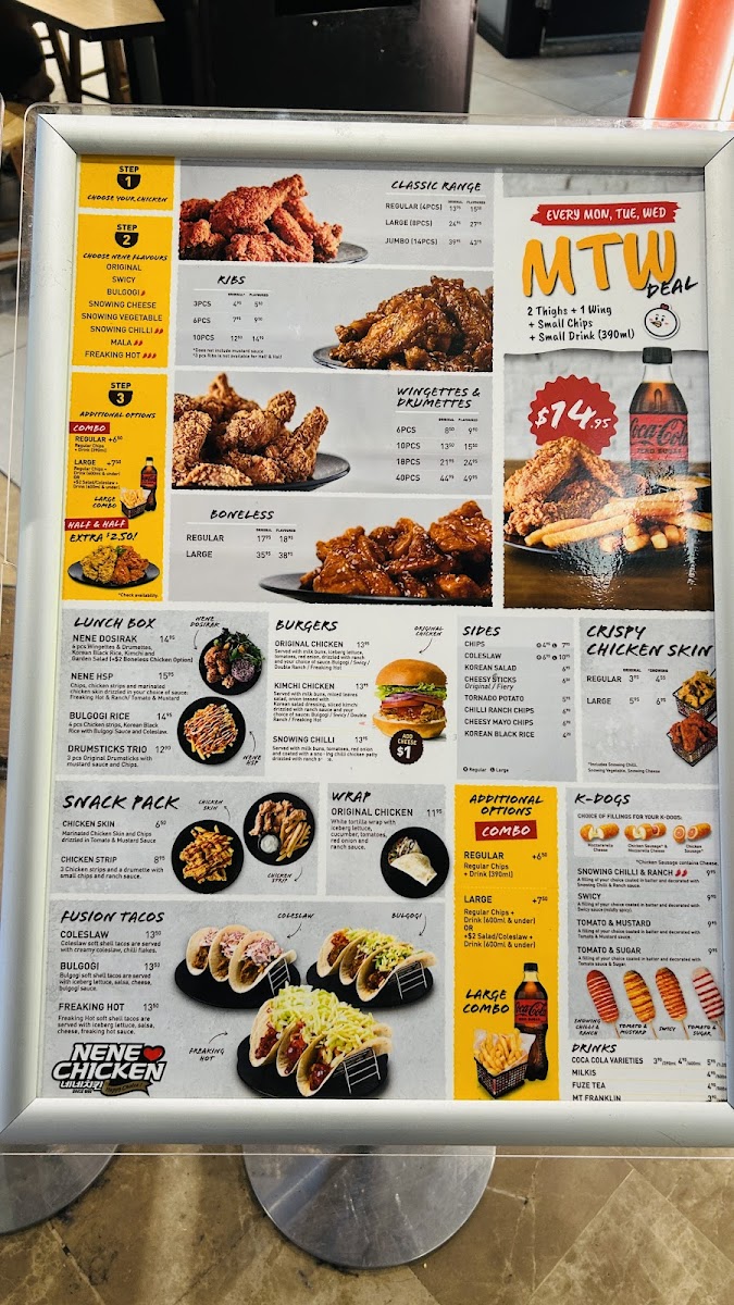 Nene Chicken Parramatta offers an impressive Korean dining experience nestled in Westfield Parramatta, just beside the Event Cinema on Level 4. The menu shines brightest with its signature Original Burger and the addictive Snowing Chilli Burger, both served with a soft milk bun and fresh toppings, perfectly complemented by ranch or various sauces. Fans rave about the Snowing Cheese chicken wings—crispy on the outside, juicy inside, and generously coated with a luscious cheese flavor that has become a crowd favorite. For those seeking variety, the Flavored Ribs and Soft Tacos come in exciting options like Bulgogi and Freaking Hot sauce, delivering a fusion of bold Korean spices and comforting textures. Customer reviews praise not only the food’s vibrant, spicy notes but also the swift service and friendly staff, making it a go-to spot for both dine-in and takeaway. Nene Chicken Parramatta is a must-visit for anyone craving authentic Korean fried chicken with a modern twist.