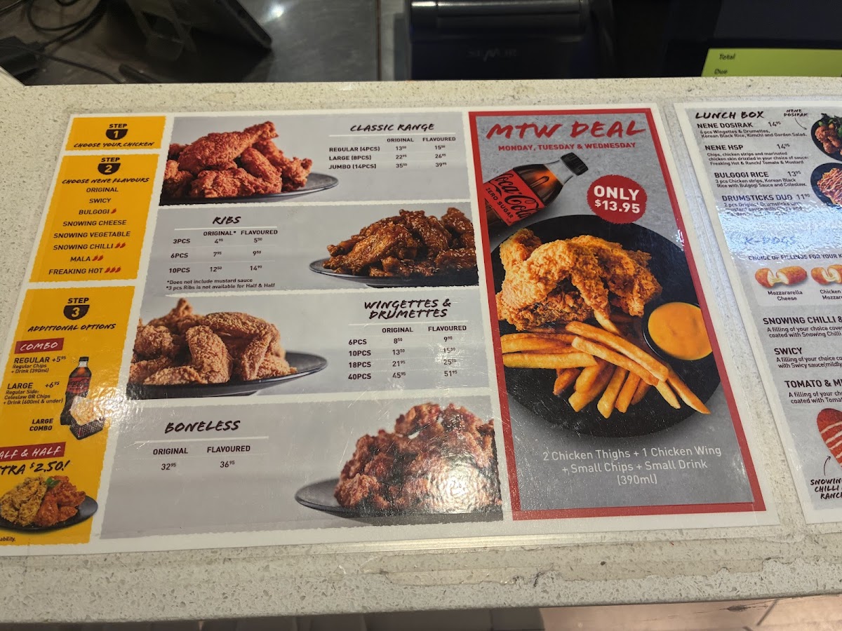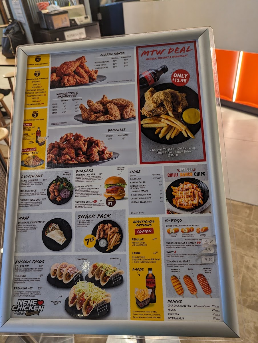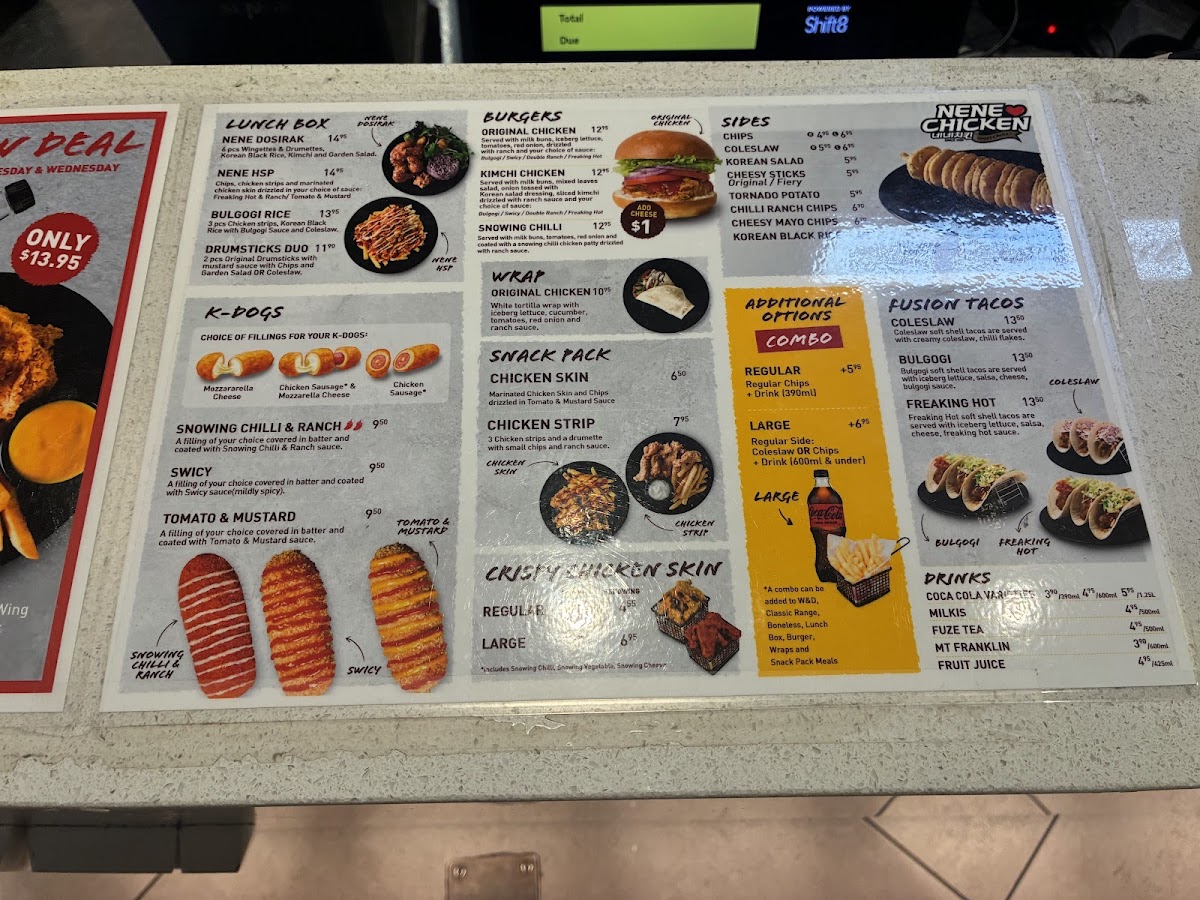 Nene Chicken Parramatta offers an impressive Korean dining experience nestled in Westfield Parramatta, just beside the Event Cinema on Level 4. The menu shines brightest with its signature Original Burger and the addictive Snowing Chilli Burger, both served with a soft milk bun and fresh toppings, perfectly complemented by ranch or various sauces. Fans rave about the Snowing Cheese chicken wings—crispy on the outside, juicy inside, and generously coated with a luscious cheese flavor that has become a crowd favorite. For those seeking variety, the Flavored Ribs and Soft Tacos come in exciting options like Bulgogi and Freaking Hot sauce, delivering a fusion of bold Korean spices and comforting textures. Customer reviews praise not only the food’s vibrant, spicy notes but also the swift service and friendly staff, making it a go-to spot for both dine-in and takeaway. Nene Chicken Parramatta is a must-visit for anyone craving authentic Korean fried chicken with a modern twist.